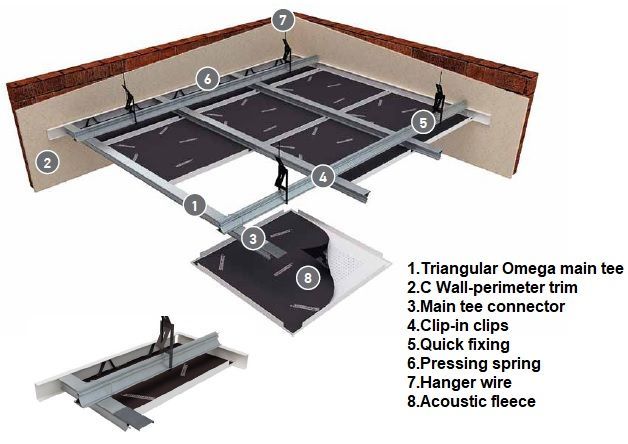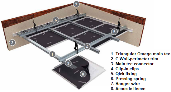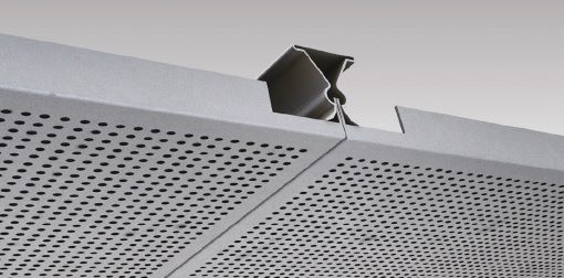 Our standard Clip in system consists of a concealed supporting structure (Spring Tee) where demountable tiles can be clipped into the triangular omega main runner. The grid system is not visible and provides a more continuous look compared to a standard grid system. All panels are singularly and independently demountable thus enabling easy and fast access to the ceiling plenum.