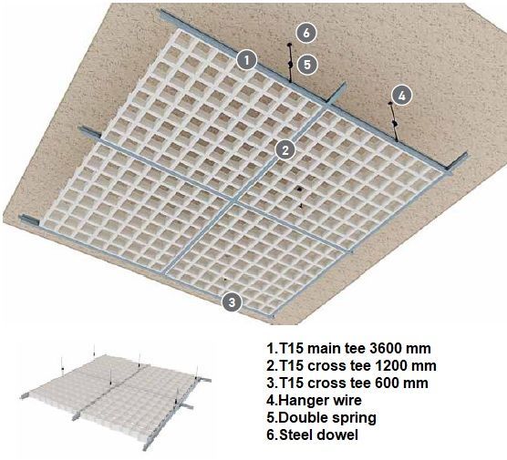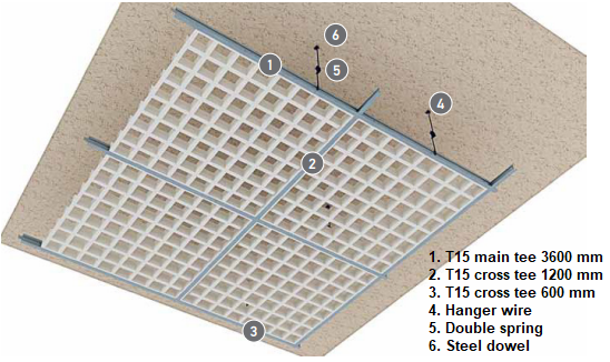 T15 Open cell ceilings create an even plenum to cover services and generate an open ceiling where aluminium panels are combined to create equal cells and then allowed to rest on standard T15 profiles.
